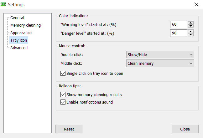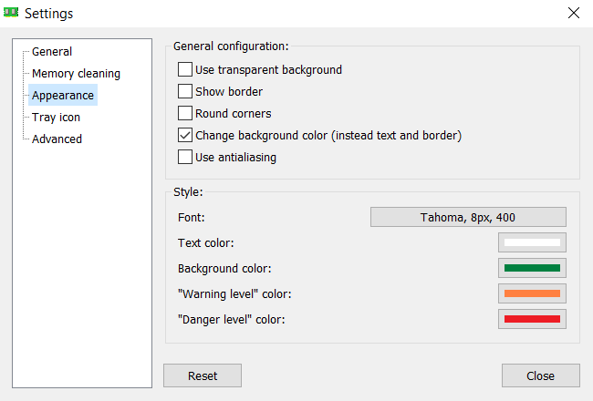 在这里,你可以设置各级别启动的指示,以及应用于外观设置的颜色。例如,当内存使用率超过 60% 时,托盘图标会变为橙色,以提醒你注意。