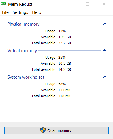 在软件主界面,可以查看物理内存(Physical memory)、虚拟内存(Virtual memory)和系统工作集的具体数据(System working set)。界面底部为清理内存按钮。